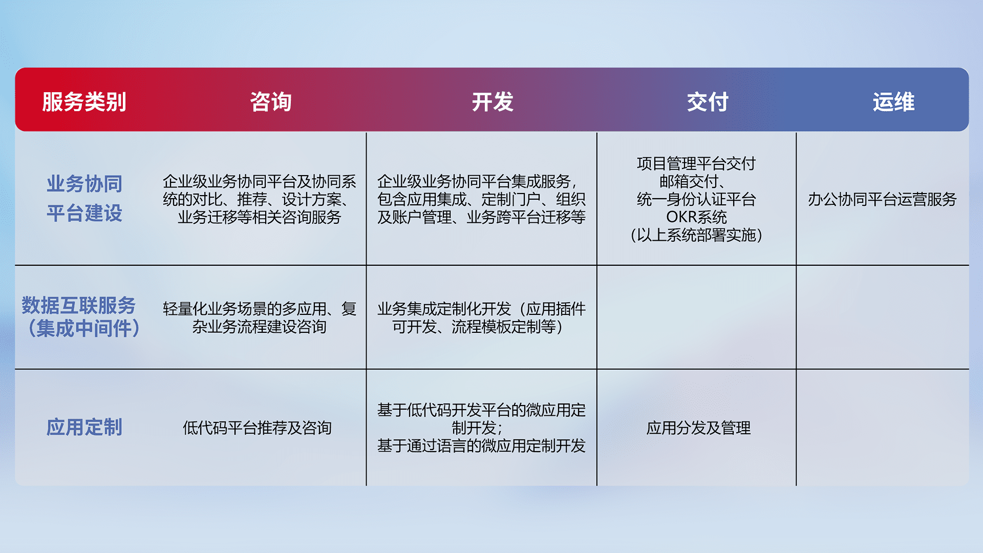 针对钉钉、、、、企微、、、IDaas等平台级产品提供产品的规划、、方案、、交付、、定制化开发等服务,,实现如统一协同办公、、、、智能客户服务、、、混合会议管理、、智能数据查询、、等业务场景,,,,实现数字化转型。。。